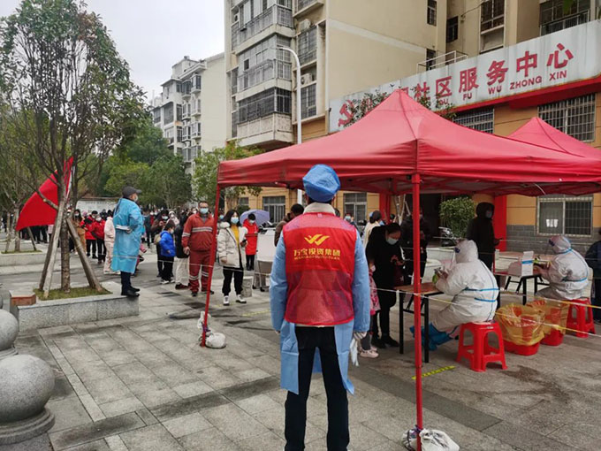 12月3日,萬寶投資集團(tuán)黨員志愿者在盛世嘉園小區(qū)核酸檢測現(xiàn)場幫助社區(qū)工作人員開展場所碼登記、秩序維護(hù)等工作。